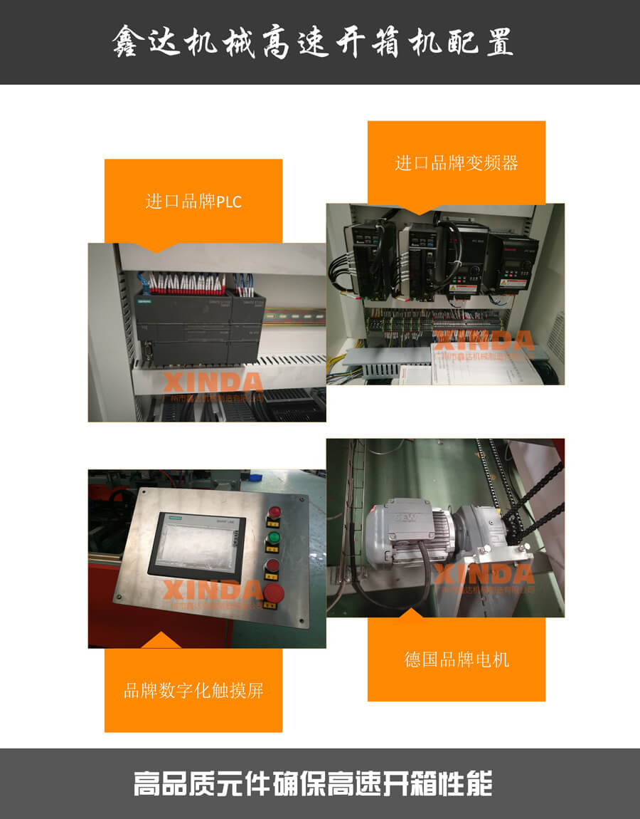 鑫達(dá)機械高速開箱機目前速度分為12箱立式開箱機、15箱臥式開箱機、25箱臥式開箱機、35箱臥式高速開箱機以及45箱高速開箱機5種速度型號,其中立式開箱機是采用吸盆吸取成型、皮帶傳輸;而臥式高速開箱機統(tǒng)一采用進(jìn)口德國品牌SEW電機傳動、臺灣臺達(dá)伺服電機成型、德國費斯托真空吸盆,自強鏈條品牌傳輸、西門子PLC核心控制系統(tǒng);以上高品質(zhì)零配件確保了鑫達(dá)機械高速開箱機的持續(xù)開箱能力達(dá)95%以上,紙箱損壞率在千分之一以內(nèi),采用此款高速成型機,確確實實的保證了客戶的耗材成本。